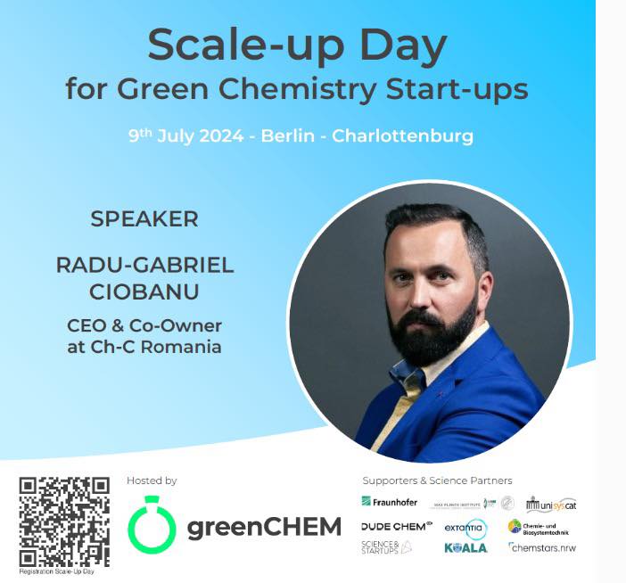 Suntem încântați să vă anunțăm că Radu Ciobanu, CEO Ch-C Romania, va fi speaker la Scale-up Day for Green Chemistry Start-ups, un eveniment care reunește vizionari, experți din industrie, startup-uri și studenți pentru a dezbate provocările și oportunitățile adoptării principiilor chimiei verzi.